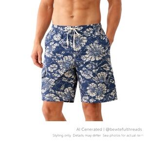 Lands’ End M Navy Floral Swim Trunks 9” Cargo Beach