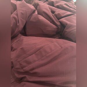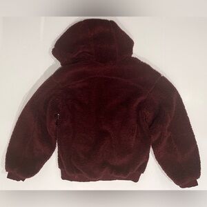 Excellent pre-owned condition. Merlot colored fleece jacket. Reversible jacket. Includes a hood with drawstring cinch.