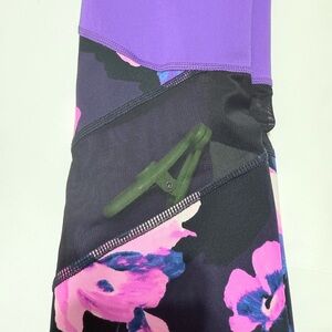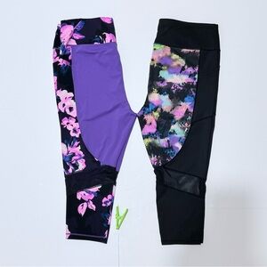 This bundle includes two pairs of LuLaRoe Rise "Fearless" fitness leggings. Designed for performance and style, these feature a solid purple body with a vibrant pink and black floral contrast on the waistband and side panels