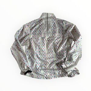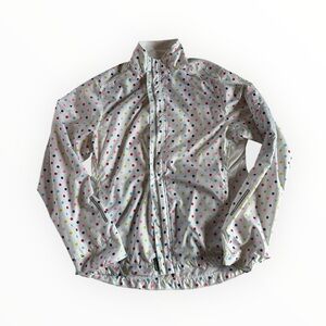 Stylish utility jacket with vibrant polka dots. Lightweight and versatile. Perfect for casual wear.