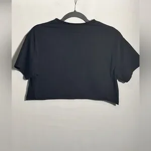 Chic black crop top with bold lettering. Perfect for a modern look. Soft and comfortable fabric.