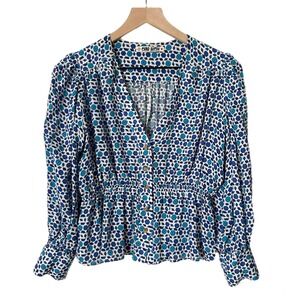 Ciao Lucia Blue White Silk Geometric Peplum Blouse V-Neck Long Sleeve Size XS
