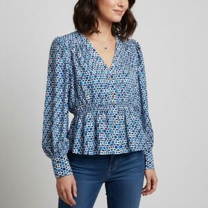 Lightweight silk blouse features a vibrant blue and white geometric tile print with a subtle evil eye motif. Designed with a flattering V-neckline and a button-front closure, it includes an elasticized peplum waist that creates a feminine silhouette. The long sleeves are finished with buttoned cuffs, while the back yoke with light pleating ensures a comfortable drape.