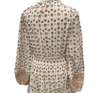 Size medium women's US Style: Blakely Long sleeve peasant dress in lovely neutral print POCKETS!! Very stretchy waist with belt that ties; balloon sleeves Button-down to waist; tassels that hang down at neck Fully lined; This dress is so lovely! 100% cotton Measurements taken across the front when laying flat: Bust: 18", Waist: 14" and very stretchy, Length: 45", Sleeve length from neck: 28"