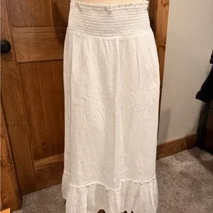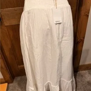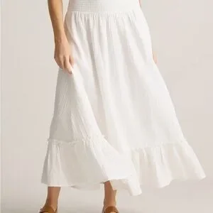 Elegant white maxi skirt by Quince. Features a smocked waistband and flared hem. Ideal for any occasion.