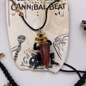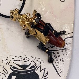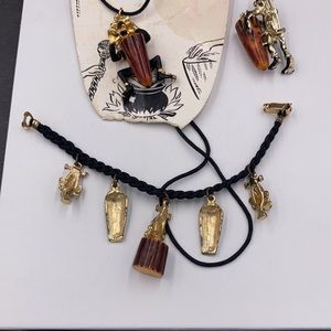 This amazing set from the 1960’s features native drummers playing bakelite drums. The necklace card says” Babalu Pete with the Cannibal Beat”. The bottom of the card originally said Made in USA. The brooch and necklace pendant are slightly different figures. The hard to find bracelet of braided chord has one bakelite figure, two drums and small figural heads. Fold over clasp. Please note: although these are often sold as a European designer, Charles F Worth, that fallacy has been debunked. These were made in the USA with bakelite from England. Sold as a set, will not separate.