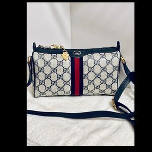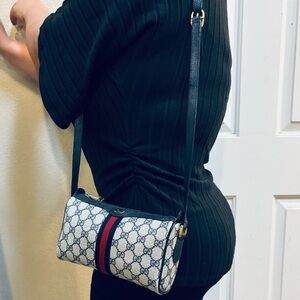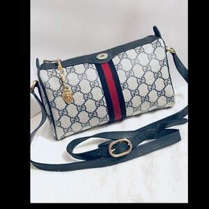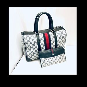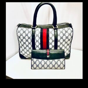 Stylish Gucci travel bag set with iconic pattern. Features bold red stripe and black accents. Perfect for chic journeys. The bags are in great condition wallet has more used check pictures