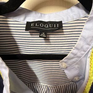 •Classic Eloquii shirt dress featuring blue-and-white pinstripes with a statement colorblock bib detail. Designed with a split neckline, button-front placket, and roll-tab sleeves for versatile styling. Easy, polished silhouette perfect for work or everyday wear.