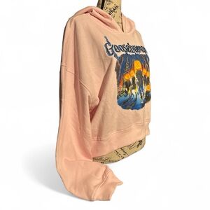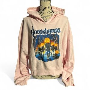 This super cozy, light pink hoodie features a classic R.L. Stine "Goosebumps" graphic of pumpkin-headed figures walking through a spooky forest. It includes a unique sleeve print with various Goosebumps icons and a soft fleece-lined interior. Perfect for fans of 90s Nickelodeon nostalgia or spooky season vibes!