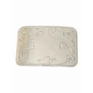 Classic vintage Western-style belt buckle crafted in faux silver metal with detailed floral etching.