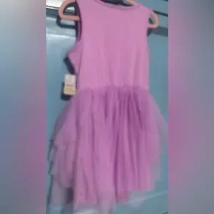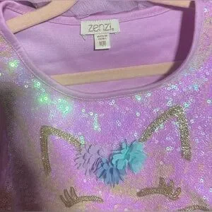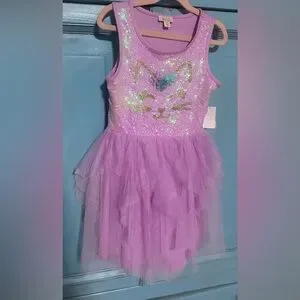 Charming purple dance costume with glittery cat design. Perfect for kids' performances and dress-up fun.