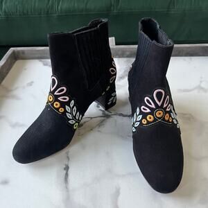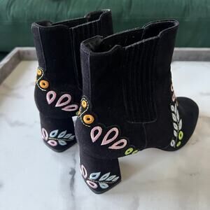 Sophia Webster 'Liliana' booties in black suede with multicolor embroidered detailing. Features an almond toe, stretch side gussets, and signature heart-stitched leather soles. Block 3" heel. Chic, playful, and crafted with Sophia Webster’s signature whimsy. Size EU 38.5 (fits US 8 best).