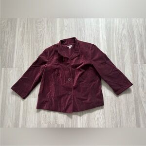 Elegant burgundy blazer. Features button closure. Perfect for formal occasions.