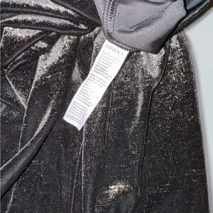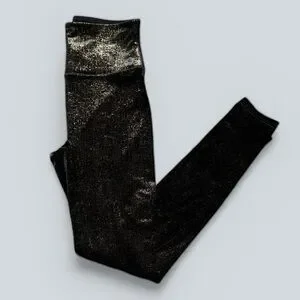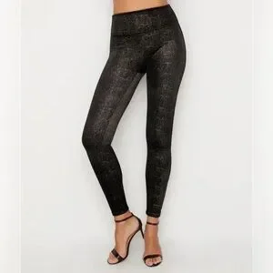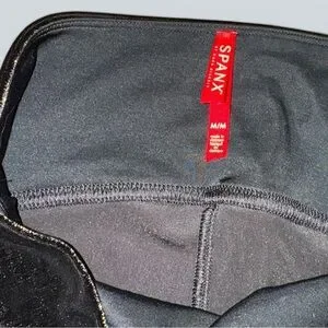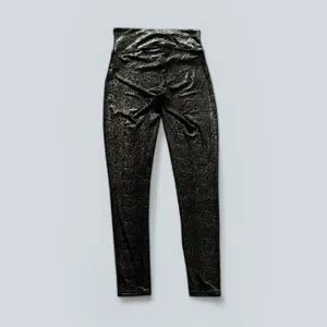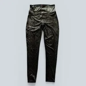 SPANX high-rise metallic leggings featuring a black base with subtle gold shimmer throughout. Designed with a shaping waistband for a smooth, flattering fit and comfortable stretch. Sleek, body-hugging silhouette.