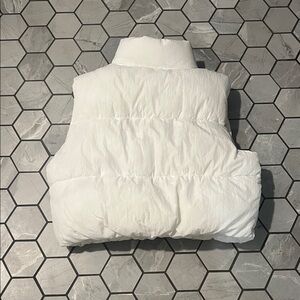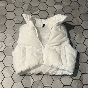 Stylish white puffer jacket. Sleeveless design. Front zipper closure. Perfect for layering.
