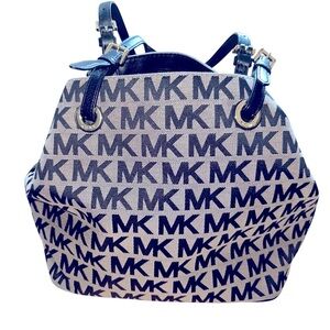 Elegant Michael Kors shoulder bag with iconic MK monogram. Features black leather accents and gold hardware. Ideal for everyday use.