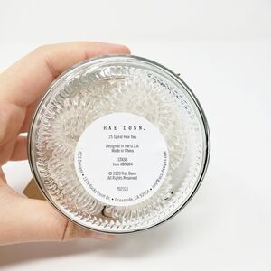 Rae Dunn clear glass jar that says "STASH" in black long letter. Wooden lid. Comes with 25 clear spiral hair ties. Makes a great gift! Looks great on bathroom counter or vanity!