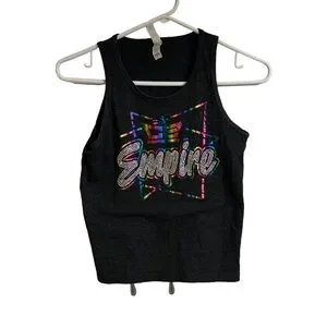 Bella Canvas charcoal graphic tank top with sequinned word Empire and rainbow colored background.