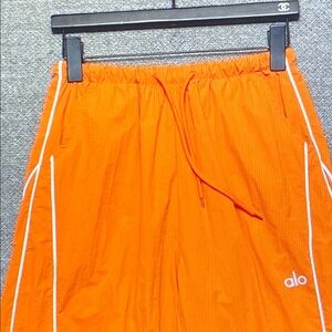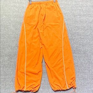 Vibrant orange track pants and jacket set. Features white piping details. Comfortable and stylish for active wear.