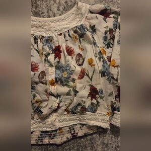This delicate and ethereal blouse exudes bohemian sophistication with its beautiful floral cotton voile fabric inspired by the sun-drenched landscapes of Provence. Featuring intricate pintuck and embroidered lace detailing along the neckline and cuffs, this semi-sheer piece drapes effortlessly into a romantic silhouette. The billowy bishop sleeves add volume and feminine charm, while the fitted waistline and button-up front create a flattering contrast that celebrates your natural shape. Made from 100% cotton with a cropped length (19\" from shoulder), this timeless staple is perfect for effortless, everyday styling or elevated occasions. From a smoke, pet and fragrance free home.