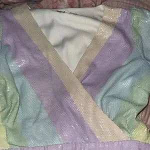 Chic wrap top and skirt with pastel rainbow stripes. Features soft pink, blue, green, and purple tones. Ideal for a trendy outfit.