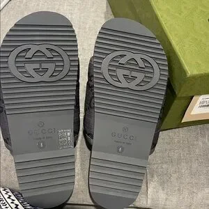 NWT Gucci slides in gray. Features bold logo pattern.