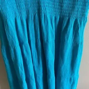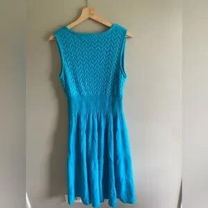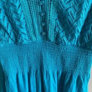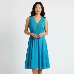 The Claudia Richard Women's Babydoll Dress in Aqua is a vintage-inspired piece perfect for a beachy, Y2K vibe. This tiered dress features a V-neckline, sleeveless design, and embroidered accents for added charm. Made of lightweight cotton fabric, this midi-length dress is lined and ideal for casual occasions or travel. The fit and flare style, along with the blue color and marine theme, make it a versatile option for summer, fall, and spring seasons.