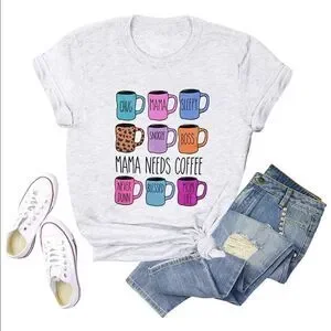 New in Bag. Woman’s size small graphic T-shirt. Size small. “Mama Needs Coffee”! For every sale, ten percent will be given to different charity. This item qualifies for Meals on Wheels.