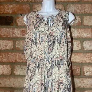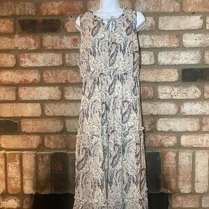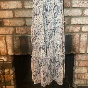 Flowy paisley maxi dress by Indigo Rose in size 2X. Features a tiered skirt, elastic waist, and tie neckline. Excellent condition and ready for summer, vacation, or an easy elevated everyday look.