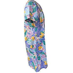 Vintage MuMu style housedress by Movie Star brand in ladies US size M. This casual day dress is a classic mid century look - manufactured in the late 1970's as a retro throwback. The dress works as a lightweight robe but many women would wear these all day long - knee length cotton & polyester blend fabric in a pretty multicolor floral print - front patch pockets - snaps closed down the front - quilted details at the round neck and sleeves. This house dress appears to be new without tags - no wear - no damage or flaws - perfect example to add to your collection or wear today!
