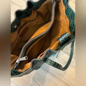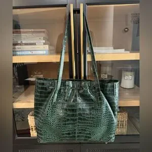 This Patricia Nash tote features a sophisticated crocodile-embossed leather in a deep forest green, accented by a distinctive front tassel and drawstring detail. The interior is thoughtfully organized with a central zip compartment and multiple pockets, all lined in a soft faux-suede. It comes with its original dust bag for protection. This bag is in excellent pre-owned condition with no visible signs of wear on the exterior or interior. It has been well-maintained and retains its structured shape beautifully. This versatile tote is ideal for professional settings, weekend outings, or as an elevated everyday carryall.