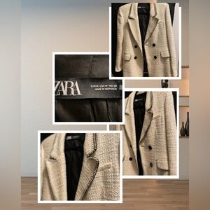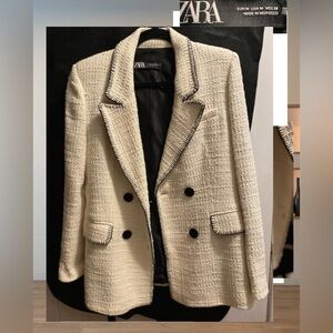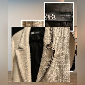 Chic Zara blazer in cream with black trim. Features textured design and stylish accents.