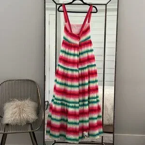 Bright and bold stripes. Sleeveless with a tiered skirt. Ideal for summer days.