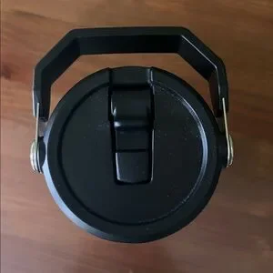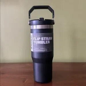 Sleek Stanley tumbler with flip straw. Black and silver design. Ideal for cold drinks.