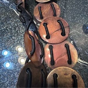 Vintage 70’s Style Tortoise Shell Brown Molded Plastic Double Strand Belt. Featuring a striking combination of brown and black, this accessory adds a bold touch to any outfit. Elastic is between links so it’s a bit stretchy. The clasp is a metal that is black