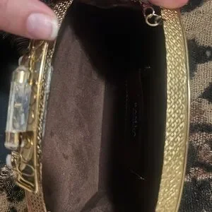 Beautiful handmade mother of pearl brass with 14k gold electroplated finish. Great pre owned conditions. It’s just a different type of bag than what is out there right now. It is very elegant and sophisticated. It can be worn as a shoulder bag or turned into a clutch. My iPhone 13 Pro Max fits in it.