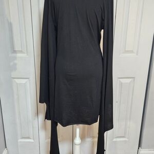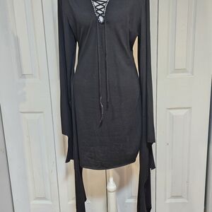 Unleash your inner goth with this black dress. Features dramatic bell sleeves. Perfect for a bold look.
