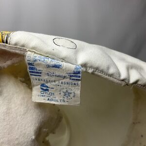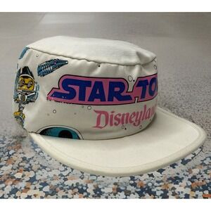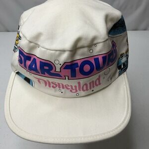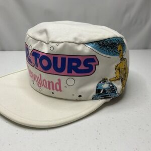 This vintage Star Wars Tours hat is a must-have for any Star Wars fan. The white fitted cap features the iconic R2-D2 retro design, perfect for any 80s Disneyland Parks USA look. Made in the United States, this hat is suitable for adults and is a one-size-fits-all. The Disneyana collectible is perfect for the Star Wars Celebration convention/event and is sure to turn heads with its unique design. The hat is branded with the Disney franchise and is a great addition to any Star Wars character/story/theme collection. Don't miss out on this unisex hat that is suitable for any fan of the franchise.