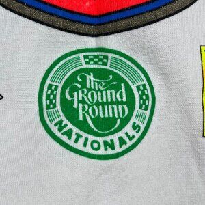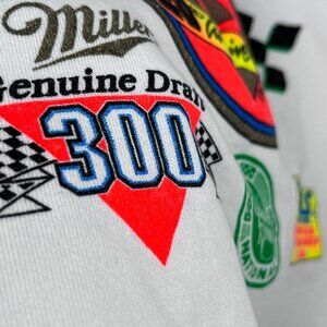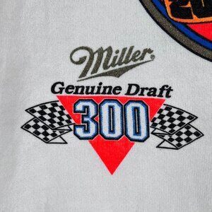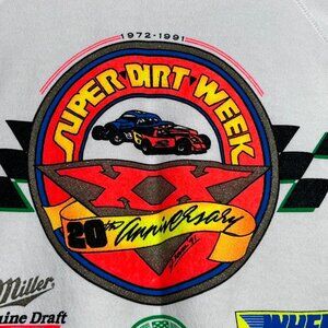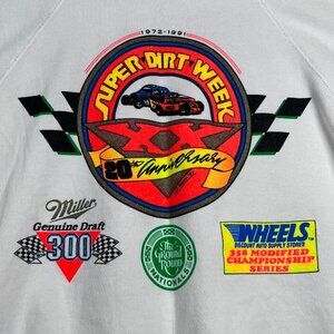Vintage Super Dirt Week 91 Syracuse New York. Vibrant front and back graphic. Sleeve graphic has spot at top of sleeve.. Raglan style sleeves, hooded. Sponsors: Miller Genuine Draft 300, The Ground Round and Wheels Discount Auto Supply Stores. 20th anniversary. Action Sportswear. Dallas, Texas, USA 91.