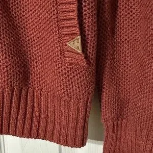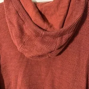 A cozy hood tops this textured knit pullover crafted from supersoft fibers. Drawstring hood. Long sleeves. Button half-placket. 100% cotton. Oxblood burgundy. Good condition.