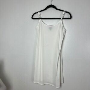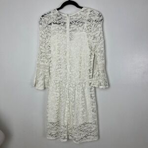 Intricate floral lace overlay defines this elegant dress, featuring a dramatic lace-up grommet neckline and 3/4 length bell sleeves with ladder-stitch detailing. The piece comes with a matching removable spaghetti strap slip for full coverage while maintaining the delicate sheer aesthetic of the lace. A hidden back zipper ensures a smooth fit through the bodice and slightly flared skirt. The lace dress itself is in excellent pre-owned condition but the slip has a few minor spots of discoloration as shown in photos.