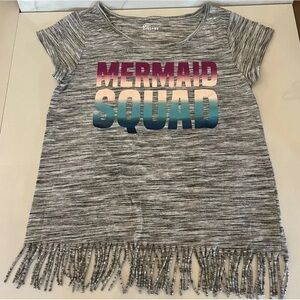 Gray short sleeve tee with colorful 'Mermaid Squad' graphic. Fringe hem adds fun style.