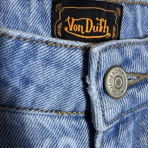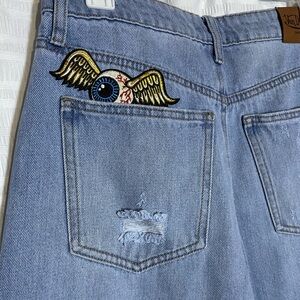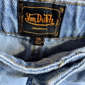 Trendy jeans with Von Dutch logo patches. Features unique graphics and distressed accents. Light wash, high waist, wide leg, embroidery, distressed. Excellent condition! Enjoy!