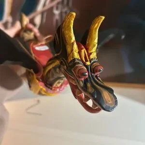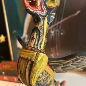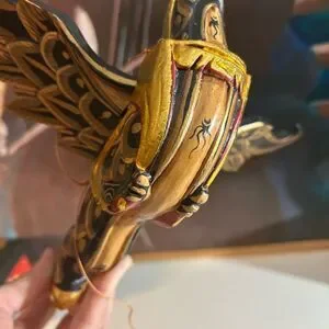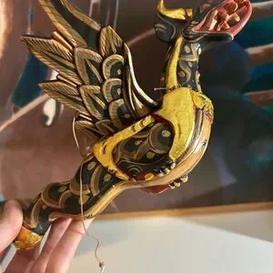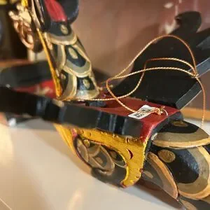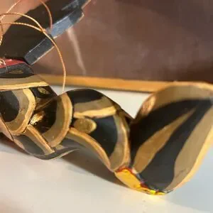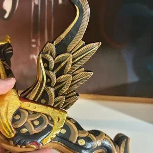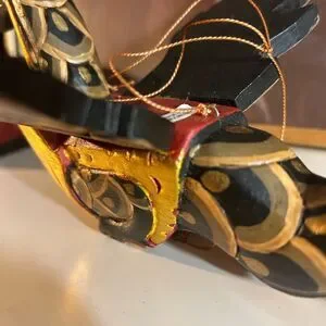 This Dragon Naga Flying Hanging sculpture is handmade in Bali, Indonesia. The black and gold design, measuring 11.5" inches in length, adds an Asian touch to any home decor. Crafted from wood and showcasing intricate details, this sculpture embodies the style of Asian home cottage industry craftsmanship.
