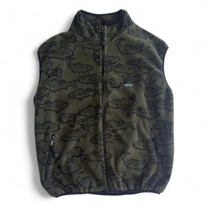 Design: Sleeveless fleece vest with a trout/fish pattern throughout, a full-zip front, and two zippered hand pockets.