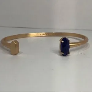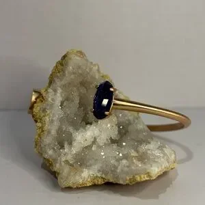 A gently brushed charm and a faceted jewel frame a slender cuff that looks great stacked with similar styles or worn solo.