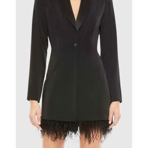 Keywords: Ieena Mac Duggal, black dress, feather trim, mini dress, cocktail dress, party dress, size 2, womens dress, evening dress, formal dress, blazer dress, satin collar, fitted dress