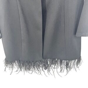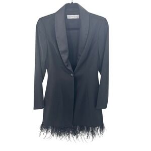 Chic little black dress with a touch of glamour. This sleek mini dress features a tailored blazer-style bodice, complete with a single button closure and sophisticated satin shawl collar. Its most striking feature is the playful feather trim that graces the hemline, adding a flirty and eye-catching element.