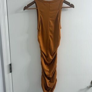 Pink Lily ribbed bodycon mini dress in the prettiest warm rust/caramel tone. Super stretchy, soft ribbed fabric that hugs in all the right places. Perfect for layering or wearing solo for a night out.