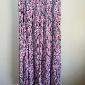 India Collection by Emerson Fry tiered maxi dress showcases a vibrant block print pattern in shades of pink, blue, and orange. Crafted from soft modal with an organic cotton lining, this lightweight piece features adjustable tie-shoulder straps and a comfortable smocked back panel for a flexible fit. The tiered skirt adds a breezy, feminine silhouette perfect for warm-weather styling.